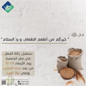 نستقبل #زكاة_الفطر في مقر الجمعية بعد صلاة المغرب يوم الأربعاء الموافق ٢٨/ ٩ وحتى ليلة العيد.