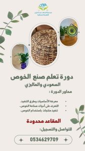 تعتزم جمعية الملك عبدالعزيز الأهلية النسائية ( عون ) بإقامة دورة ( تعلم صنع الخوص – السعودي والماليزي )
