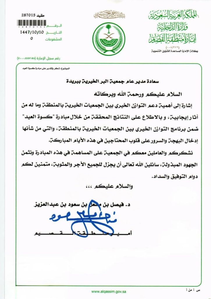 يثمن لجمعية بر بريدة وجميع منسوبيها المساهمة في مبادرة التوازن الخيري والجهود المبذولة في الجمعية لإدخال البهجة والسرور لمستفيدي جمعيات أخرى.